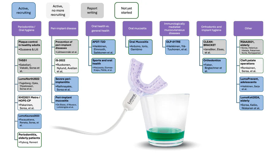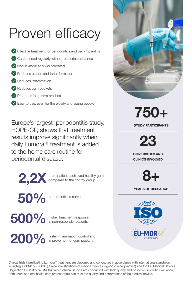 Lumoral is used to prevent tartar buildup, especially in areas of the mouth that are difficult to clean but easily accumulate tartar such as molars and dental prostheses. Lumoral treats periodontitis by eliminating plaque and by reducing gingival bleeding, and the number of deepened gingival pockets (Pakarinen et al. 2022).