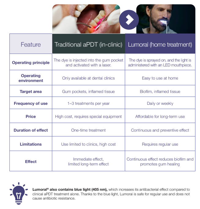 According to EFP treatment recommendations, professional and home supragingival biofilm control is highly recommended for all periodontitis patients. However, the EFP does not recommend traditional photodynamic therapy (aPDT). The lack of suitable light sources has slowed its widespread adoption, and in dentistry it has mainly been used in clinics utilizing laser light. Studies show that treatment should be given regularly to achieve a lasting effect, but the method has been limited to expensive, one-off treatments.