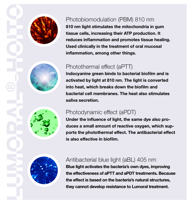 Lumoral reduces the risk of caries, halitosis, and gum disease and it facilitates mechanical cleaning. Bacteria are more easily eliminated from the mouth once they are dead.