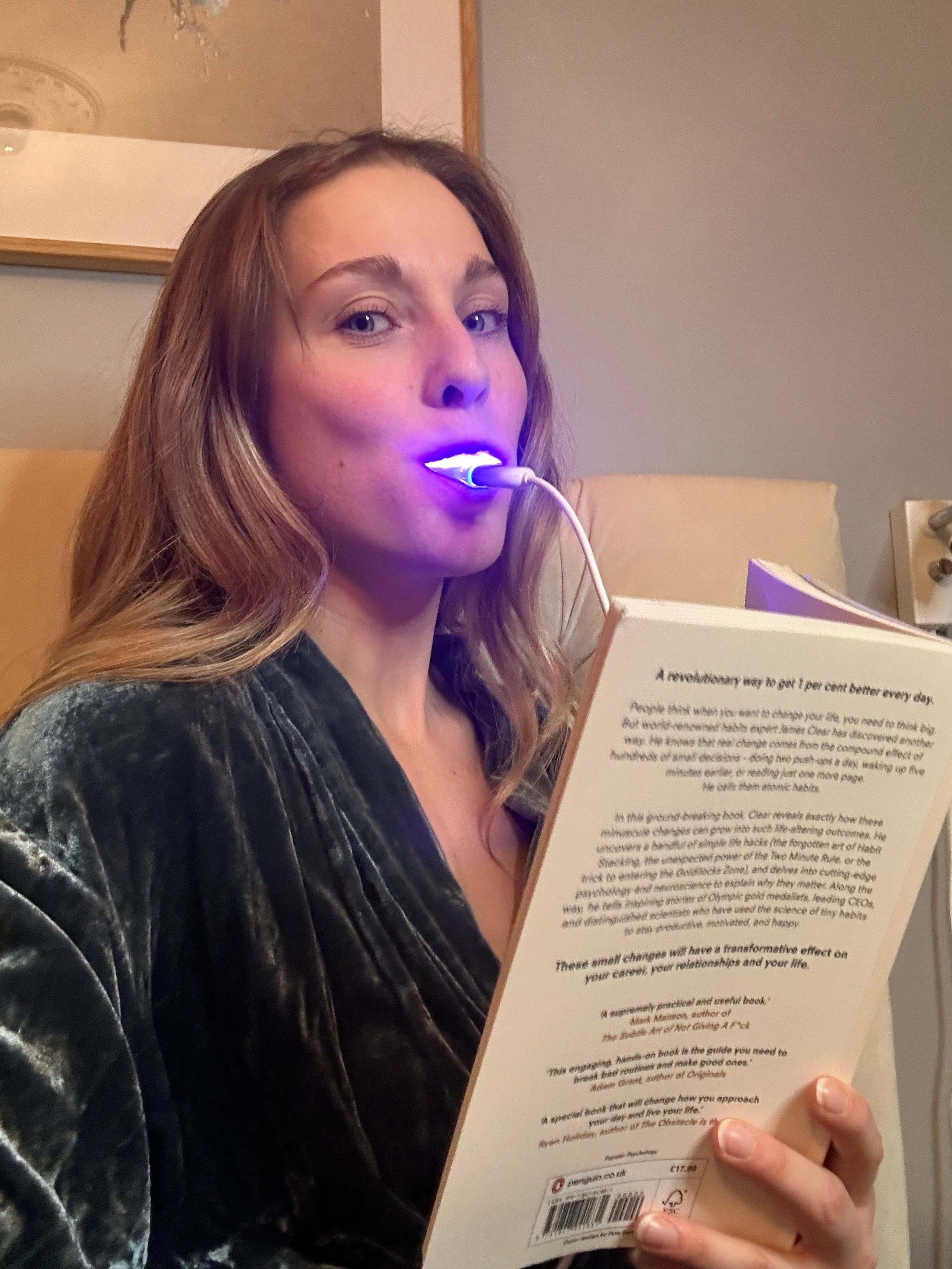 Place the mouthpiece in your mouth and leave on for 10 minutes. The light activates the mouthwash, which triggers the antibacterial effect of the treatment.